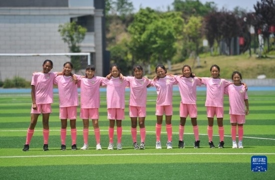 來自涼山彝族自治州的9名小球員俄地么你作、舍布么扯鳩莫、候杰欣、吉聯(lián)么李雪、呂小英、趙明練、楊貴洋、拉普么拉扎、楊建鑫(從右至左)在瀘州天立春雨學(xué)校足球場(chǎng)留影(5月12日攝)。