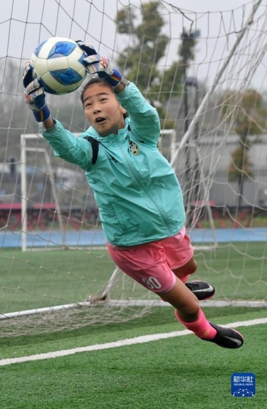 在瀘州天立春雨學(xué)校足球場(chǎng),來自涼山彝族自治州的拉普么拉扎在進(jìn)行守門員訓(xùn)練(3月29日攝)。