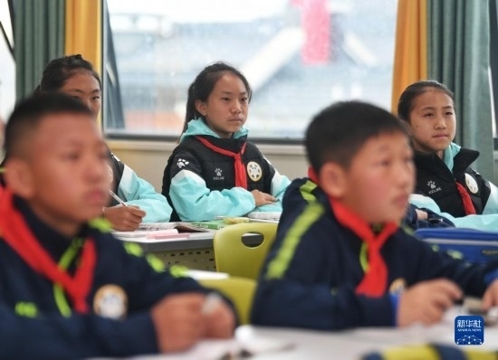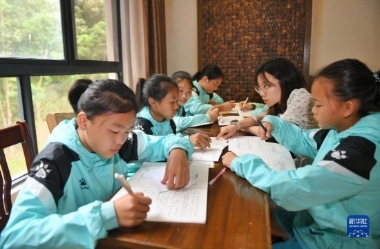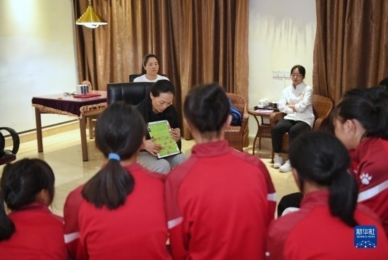 在海南瓊中縣舉辦的中國(guó)足協(xié)女足青訓(xùn)中心“希望杯”U12組比賽的空閑時(shí)段,來自涼山彝族自治州的四川隊(duì)隊(duì)員舍布么扯鳩莫(左二)和隊(duì)友們?cè)诶蠋煄ьI(lǐng)下學(xué)習(xí)文化課(4月10日攝)。