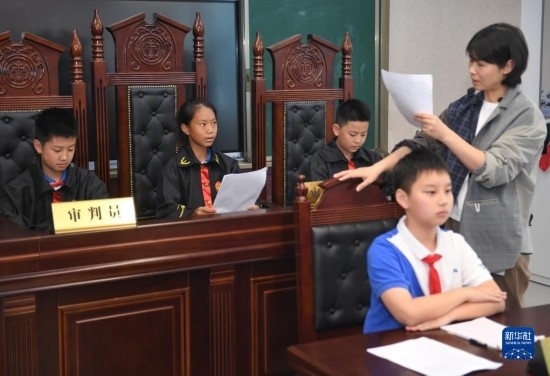 在瀘州天立春雨學(xué)校教室,來自涼山彝族自治州的舍布么扯鳩莫(左二)和同學(xué)們上模擬法庭特色選修課(5月11日攝)。