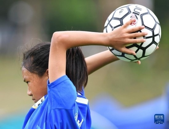 在海南瓊中縣舉辦的中國(guó)足協(xié)女足青訓(xùn)中心“希望杯”U12組四川隊(duì)對(duì)陣廣東隊(duì)的比賽中,來自涼山彝族自治州的四川隊(duì)球員舍布么扯鳩莫發(fā)邊線球(4月10日攝)。