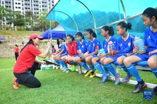 在海南瓊中縣舉辦的中國(guó)足協(xié)女足青訓(xùn)中心“希望杯”U12組比賽的空閑時(shí)段,四川隊(duì)主教練陳華(中)為隊(duì)員進(jìn)行戰(zhàn)術(shù)指導(dǎo)(4月9日攝)。