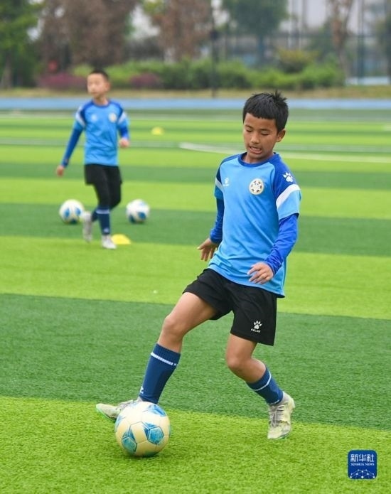 在瀘州天立春雨學(xué)校足球場(chǎng),來自涼山彝族自治州的金貴坤(右)與隊(duì)友進(jìn)行訓(xùn)練(3月28日攝)。