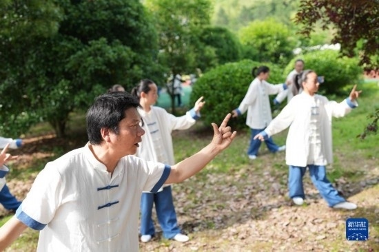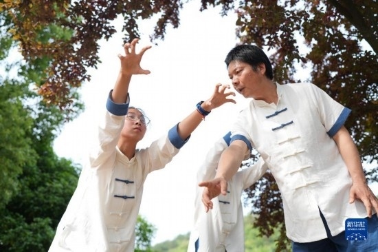 5月25日,小學(xué)生在教練帶領(lǐng)下練習(xí)五禽戲。