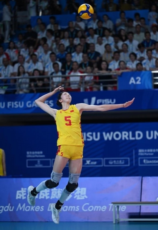 8月6日,吳夢潔在第31屆世界大學(xué)生夏季運(yùn)動會女子排球金牌賽中發(fā)球。新華社記者 胥冰潔 攝