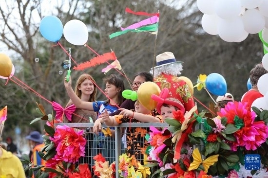 這是9月23日在新西蘭黑斯廷斯拍攝的“迎春花車巡游日”活動(dòng)現(xiàn)場(chǎng)。
