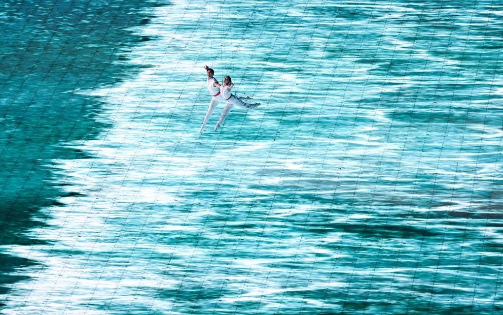 本屆亞運(yùn)會(huì)首次將3D雙威亞技術(shù)應(yīng)用于大型運(yùn)動(dòng)場(chǎng)中。立體飛旋于空中的男女演員與潮共舞,吊著威亞的他們?cè)诳罩型瓿闪烁鞣N高難度動(dòng)作,并與地屏中的浪潮實(shí)時(shí)互動(dòng),踏浪而行,成就了科技與藝術(shù)完美融合。