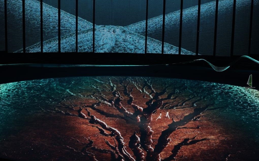 吉祥物“江南憶”破水而出,騰躍而起。“動(dòng)起來”的“琮琮”“蓮蓮”“宸宸”彈奏起圓形的“水浪鋼琴”,激活了象征著數(shù)字賦能杭州城市建設(shè)的“芯片面板”。660根數(shù)控光源棒點(diǎn)亮“科技之潮”,AR虛擬半球狀的數(shù)字穹頂營(yíng)造出震撼的立體空間。