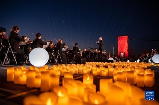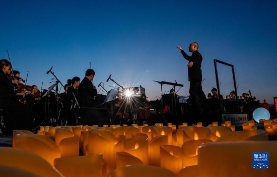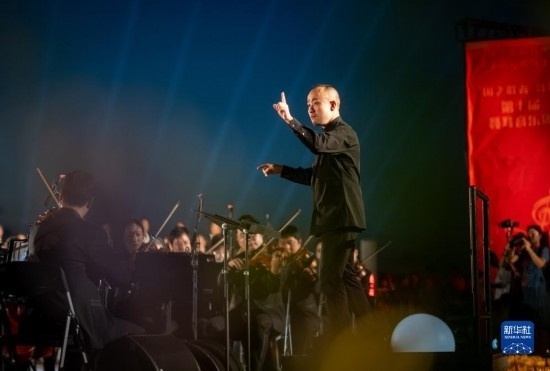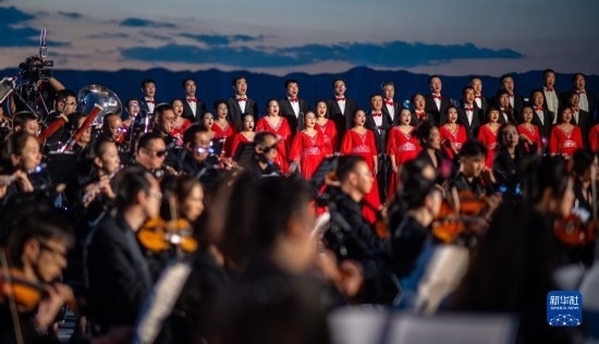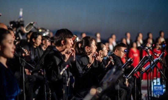 來自昆明聶耳交響樂團(tuán)及昆明市民族歌舞劇院民樂團(tuán)的演奏家們在昆明市滇池畔共同演奏包括《義勇軍進(jìn)行曲》《賣報歌》在內(nèi)的聶耳代表作(7月17日攝)。