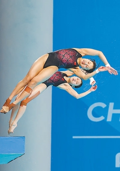 7月31日,中國(guó)代表團(tuán)選手張家齊(后)、掌敏潔在女子雙人10米跳臺(tái)決賽中。本報(bào)記者 伊 霄攝