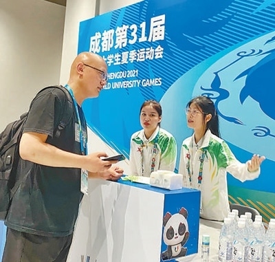 志愿者為媒體工作者提供幫助。本報(bào)記者 蔣雨師攝