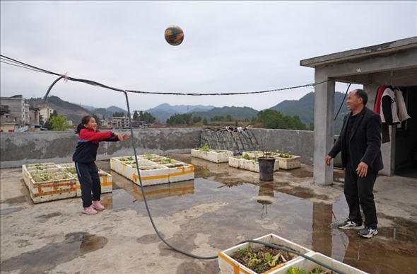 3月27日,李文文在屋頂露臺和父親玩投籃游戲。李文文是貴州臺江縣臺盤鄉(xiāng)中心小學的女籃隊長,以前他的父親在外地務工,如今火爆全網(wǎng)的“美麗鄉(xiāng)村”籃球聯(lián)賽給臺盤鄉(xiāng)帶來了人氣,父親在家門口就能找到工作。