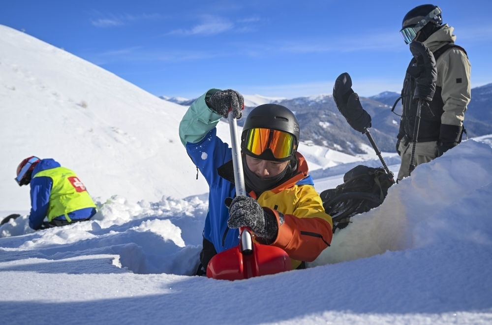 彭超(中)和新疆阿勒泰地區(qū)禾木吉克普林滑雪場救援隊一起做雪層分析,預判風險保障游客滑行安全。