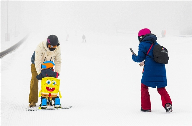 在新疆白云國際滑雪場,許秀娟(右)在給愛人和兒子拍照。哈爾濱人許秀娟曾是專業(yè)運動員,代表國家隊拿過國際大賽獎牌。退役后她來到新疆,在這里她和愛人相識,一起開辦培訓機構(gòu),面向青少年推廣冰雪運動。
