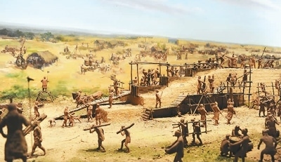 展廳里呈現(xiàn)的商代筑城場景。 鄭州商都遺址博物院供圖