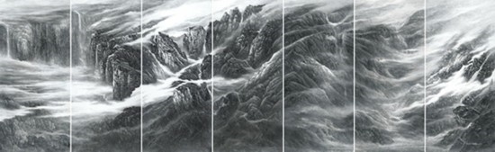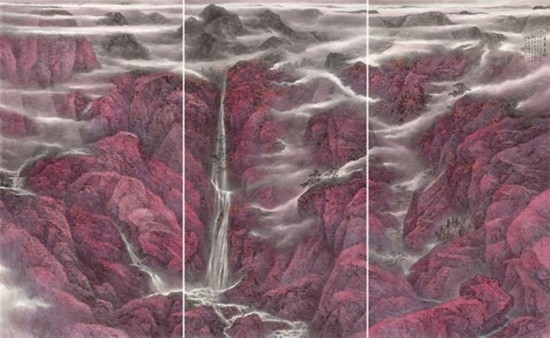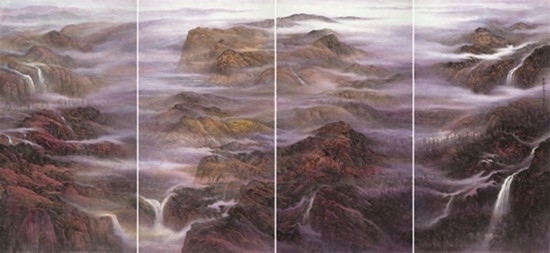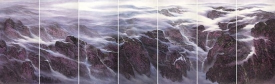且看樂震文的《直上浮云》《云卷云舒》和《黃土馳風,日月星辰》,那逶迤茫茫的群山峻嶺,那縱橫畫面的云蒸霞蔚,那連綿不絕的箭樓城堞,哪里還是傳統(tǒng)文人山水畫的淡煙輕嵐,縹緲冷逸?濃縮于畫內的精神意蘊,分明凸顯了現(xiàn)代山水畫對家國情懷的抒發(fā)。且讀張弛的《云起疊嶂》《惟余莽莽》和《紫氣氤氳》,那天光紫氣的浩渺煙云,那渾然一體的山水氣象,那千回百轉的流水飛泉,其實早已脫離了對自然山水的寫照,而是她感悟的時代精神在偌大畫面上的縱橫揮寫、主觀臆造。