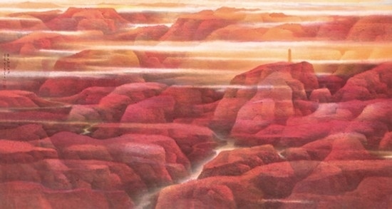 來自上海并深受海派畫學影響的樂震文、張弛,在宋元及明清山水畫學上打下了深厚的功底,也因此,他們的傳統(tǒng)山水畫深受日本民眾的歡迎。他們曾游居東瀛多年,轉道再度研習了中國傳統(tǒng)文人畫。但真正改變他們畫風的,卻是他們對中國北方大山大水的寫生攬勝。他們鐘情于英雄的太行山,忘情于革命勝地陜北高原,力求通過壯闊雄渾的山巒、連綿逶迤的群峰來表達他們的時代感悟,營構儲存于他們胸中的山川氣象。所謂“山河回聲”,正是這些作品抒發(fā)的中華民族歷經歲月風華在大好河山之中回響的奮斗激情。