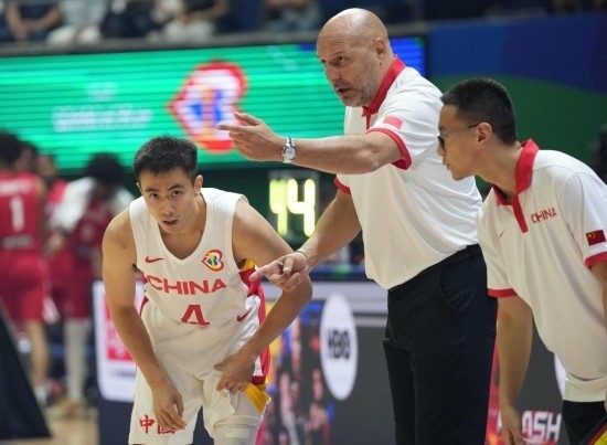 8月30日,中國隊(duì)主教練喬爾杰維奇(中)2023年籃球世界杯B組小組賽中指導(dǎo)球員趙繼偉(左)。新華社記者 孟永民 攝