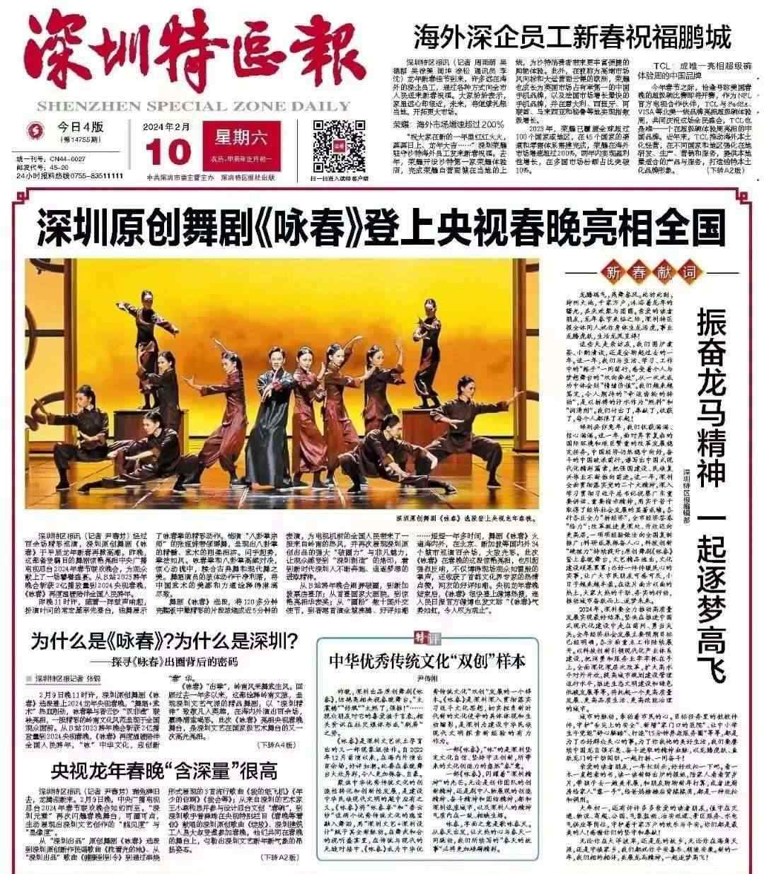 《深圳特區(qū)報(bào)》在大年初一頭版頭條對《詠春》做了報(bào)道。光明日報(bào)原總編輯何東平等首都文化界專家學(xué)者在采訪中紛紛為《詠春》成功登陸春晚大舞臺而點(diǎn)贊。
