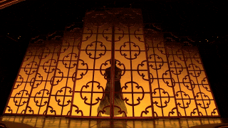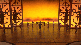 《詠春》來自舞劇《詠春》選段,已經(jīng)上演了百場,但在春晚是個(gè)特別的版本。為了創(chuàng)造出更加意蘊(yùn)豐富的想象空間,總臺臺長慎海雄在推薦這個(gè)舞劇片段時(shí),提出了幾個(gè)建議,包括演員服裝從黑色的香云紗改為絳紅色,男女主角之間的關(guān)系要從男主角一一過招“大敗”女主角改為相互切磋武藝,開場以男主角的武術(shù)剪影來增強(qiáng)吸引力,通過使用剪影效果來展現(xiàn)“葉問”的出場。當(dāng)燈光亮起,窗欞上“詠春拳”三個(gè)書法大字淡去,“葉問”的剪影如同舞動的水墨畫一般,隨即演員閃身舞出屏風(fēng),影子與真身共舞。由虛入實(shí),由平面到立體,“剪影”的設(shè)計(jì)讓短短半分鐘的獨(dú)舞大大增加了層次感和觀賞性,為空曠的舞臺創(chuàng)造出一個(gè)“頂天立地”的葉問之影,視覺震撼瞬間放大,堪稱畫龍點(diǎn)睛之筆。