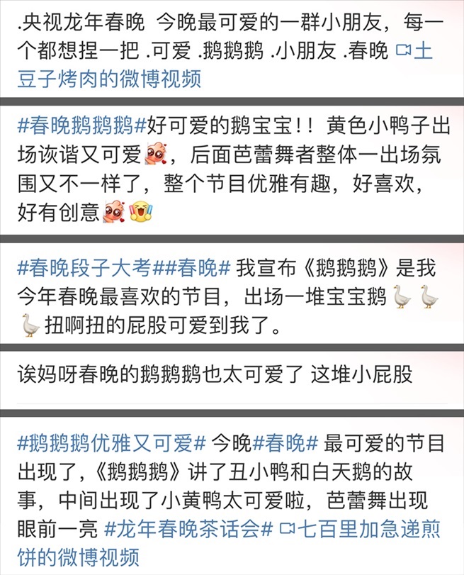 當(dāng)你提“鵝鵝鵝”,自然要期待“曲項(xiàng)向天歌”。駱賓王、唐詩宋詞、中華文化....看到節(jié)目單上的題目《鵝鵝鵝》,大概很多觀眾都以為是要詠詩。當(dāng)大幕開啟,柴可夫斯基的《天鵝湖》奏起,氣氛瞬間變得端莊典雅了,可接下來出場的是一群圓滾滾、扭著屁股的小小鵝,這波反差萌,讓網(wǎng)友直呼“創(chuàng)意絕了”。