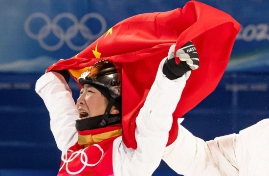 2022年2月14日,北京冬奧會(huì)自由式滑雪女子空中技巧決賽在張家口云頂滑雪公園舉行。中國選手徐夢桃在奪冠后慶祝。新華社記者 肖藝九 攝