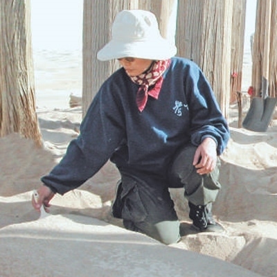 一張是晚霞中,一座小土包上豎著一根木桿,木桿頂端掛著一個(gè)金屬水桶,開著網(wǎng)絡(luò)信號熱點(diǎn)的手機(jī)裝在桶中尋找微弱的信號,一群考古工作者圍著木桿給家人報(bào)平安;一張是包裹得嚴(yán)嚴(yán)實(shí)實(shí)的考古工作者們從成堆的沙子里篩選文物殘片,漫天沙塵將他們包圍;還有一張是考古工作者們蜷縮在背風(fēng)處躲避風(fēng)沙,衣服的褶皺里積滿了沙子……