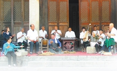 有靜也有動。如今,村中常有當(dāng)?shù)卮迕窈头沁z傳承人自發(fā)組織的“中莊秧歌”“打鐵花”等非遺演出,吸引不少游客。在司徒第院內(nèi),樹齡超400年的臘梅依舊枝繁葉茂。樹下,一位穿著白大褂、扎著白頭巾的老漢與一旁穿著紅襖藍(lán)裙的老太太一同上場,來到院內(nèi)的月臺上,一唱一和,用晉城方言演起了節(jié)目。這是村民崔有正、牛玉鳳夫婦,他們曾經(jīng)是部隊(duì)文藝骨干,現(xiàn)在利用閑暇表演。