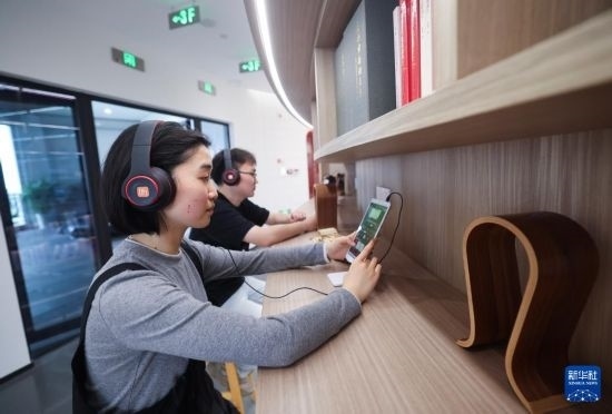 4月16日,在嘉興市南湖區(qū)新時(shí)代文明實(shí)踐中心,讀者依托數(shù)字化設(shè)備聽(tīng)“有聲讀物”。