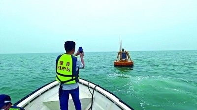 廣西合浦儒艮國家級(jí)自然保護(hù)區(qū)工作人員檢查海洋哺乳動(dòng)物水下聲學(xué)監(jiān)測浮標(biāo)。