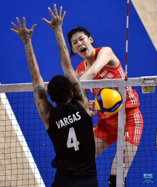 6月15日,中國隊(duì)球員王媛媛在比賽中扣球。新華社記者盧炳輝攝