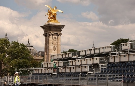 這是6月4日在位于法國巴黎市中心的亞歷山大三世橋拍攝的臨時(shí)比賽場(chǎng)地搭建現(xiàn)場(chǎng)。新華社記者 高靜 攝