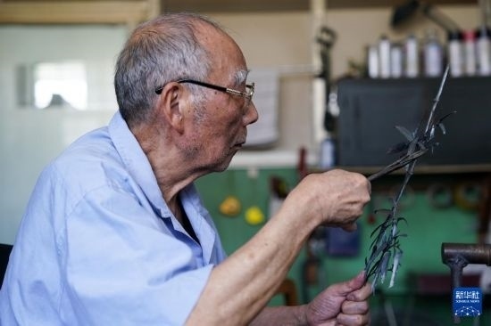 今年80歲的湯傳松,是蕪湖工藝美術廠的技術總監(jiān),也是蕪湖鐵畫鍛制技藝省級非物質文化遺產(chǎn)傳承人。據(jù)湯傳松介紹,鐵畫鍛制工藝起源于鐵匠,需將鐵燒紅,而后使用錘頭趁熱打鐵,將鐵塑造成畫稿中的基本形狀,而后使用銼、鉆等工具進一步塑造,乃至用剪刀、鑷子進行修形,再將各個部位焊接組合,最后裝裱成畫,流程繁多,制作周期較長。