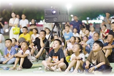 近日,在湖北省襄陽(yáng)市??悼h體育場(chǎng),孩子們?cè)谟^看電影。楊 韜攝(人民視覺(jué))