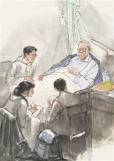 人民教師勤學(xué)篤行、求是創(chuàng)新的躬耕態(tài)度,給無數(shù)人以榜樣的力量,也給美術(shù)創(chuàng)作以靈感?!叭嗣窠逃摇眹覙s譽(yù)稱號獲得者衛(wèi)興華,終其一生都奮斗在勤學(xué)求真的道路上。90余歲時,即使病痛纏身,他仍堅持每天學(xué)習(xí)、工作。有感于衛(wèi)興華教授的敬業(yè)精神,高毅特意描繪了臥病在床的衛(wèi)興華堅持與學(xué)生探討學(xué)術(shù)課題的場景,主人公那專注的神情令人動容。像衛(wèi)興華這樣堅守耕耘的教師還有許多。劉昌明水彩畫《一個教師的工作臺》便以細(xì)致的場景描繪表達(dá)出對教師群體的敬意。貼著泛黃舊紙的墻面、藥瓶和墨水瓶之間的教案、脫漆的木桌、一副老花眼鏡……畫家在此調(diào)動了一切能夠反映老一輩教育者辛勤伏案的元素,象征著沒有直接出場的教師形象。“此處無聲勝有聲”的表達(dá)效果,令人回味無窮。