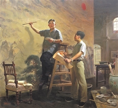 正在舉辦的第十四屆全國美術(shù)作品展覽進(jìn)京作品展上,撲面而來的藝術(shù)形象是腳踏中華大地的各族人民,是中國近現(xiàn)代文化史上的先賢圣哲,是和我們一道相擁而立的堂堂中國人。這些形象剛強(qiáng)勇毅,如潮如云,傳遞著眾志成城的精神力量,扣動(dòng)人心。譬如,呂鵬《山河頌》,以濃郁的色調(diào),再現(xiàn)傅抱石、關(guān)山月兩位前輩創(chuàng)作《江山如此多嬌》的情景,鐫刻新中國美術(shù)史上重要一幕;鄔大勇《我心中的英雄》塑造了畫家少年時(shí)代的英雄偶像——錢學(xué)森等一代科學(xué)家。還有許多氣勢宏大的創(chuàng)作,它們既是社會(huì)生活、時(shí)代精神的藝術(shù)載體,又是美術(shù)工作者面對(duì)歷史、面對(duì)人民的激情熔爐。這些作品以人民形象為根基,深植時(shí)代沃土,構(gòu)成歷史與現(xiàn)實(shí)相輝映的史詩畫卷。