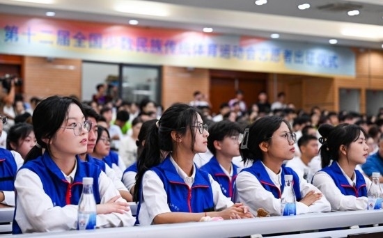 11月4日,第十二屆全國(guó)少數(shù)民族傳統(tǒng)體育運(yùn)動(dòng)會(huì)志愿者在出征儀式上。新華社記者 楊冠宇 攝