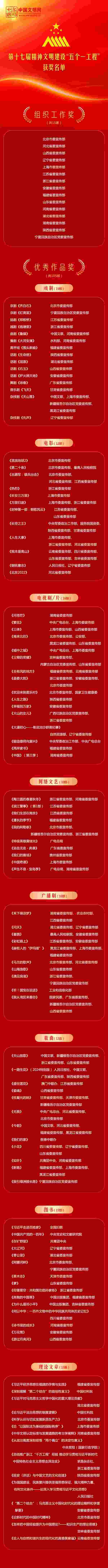 近日,中共中央宣傳部印發(fā)表彰決定,對(duì)第十七屆精神文明建設(shè)“五個(gè)一工程”組織工作先進(jìn)單位和優(yōu)秀作品進(jìn)行表彰。授予《齊白石》等15部戲劇作品、《流浪地球2》等12部電影作品、《問(wèn)蒼?!返?6部電視作品、《陶三圓的春夏秋冬》等10部網(wǎng)絡(luò)文藝作品、《禾下乘涼夢(mèng)》等10部廣播劇、《天山放歌》等12首歌曲,共105部作品“優(yōu)秀作品獎(jiǎng)”;授予北京、河北、山西、遼寧、上海、江蘇、浙江、安徽、福建、山東、河南、湖北、湖南、陜西、寧夏等15個(gè)省區(qū)市黨委宣傳部“組織工作獎(jiǎng)”。