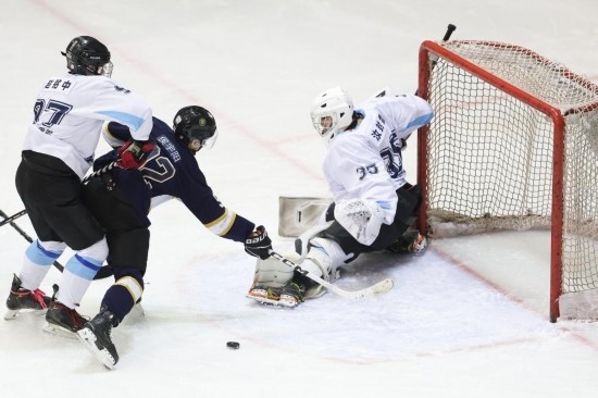 2024年12月8日,北京京獅男子冰球隊球員侯宇陽(中)在2024-2025賽季中國男子冰球職業(yè)聯(lián)賽(齊齊哈爾站)比賽中射門。新華社記者 張濤 攝