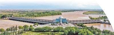 登上三盛公水利樞紐觀(guān)景平臺(tái),眼前豁然開(kāi)朗。黃河宛如一條巨龍,自天際蜿蜒而來(lái),在攔河閘壩的疏導(dǎo)和調(diào)控下,水流變得平緩有序。在這里,黃河被一分為二,一條仍沿主河道逶迤東去,一條則被引入由人工開(kāi)鑿的總干渠。