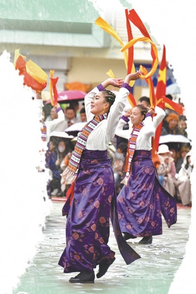 春節(jié)假期,每到傍晚時(shí)分,四川省阿壩藏族羌族自治州若爾蓋縣城中心的北上廣場(chǎng)都會(huì)準(zhǔn)時(shí)響起歡快的鍋莊曲,遠(yuǎn)道而來(lái)的游客與當(dāng)?shù)厝罕娨黄鹛饸g快的鍋莊。伴著音樂(lè),鮮艷的長(zhǎng)袖在風(fēng)中劃出道道弧線,腰飾隨著舞步搖曳,男女老少?lài)梢蝗ΑⅣ嫒黄鹞琛?/p>