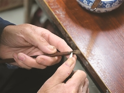 把毛料放在水中仔細(xì)清洗,就著燈光剔除一根根細(xì)微雜毛,將清理后的毛料聚合成圓直光滑、攏抱不散的錐形……走進(jìn)涇縣涇川鎮(zhèn)宣筆制作技藝代表性傳承人佘征軍的工作室,他正在為一支紫毫筆制作筆頭?!鞍拙右子性?shī)云,‘宣城之人采為筆,千萬(wàn)毛中揀一毫’。此句講的是宣筆制作工藝的復(fù)雜精細(xì)。”佘征軍說(shuō)。