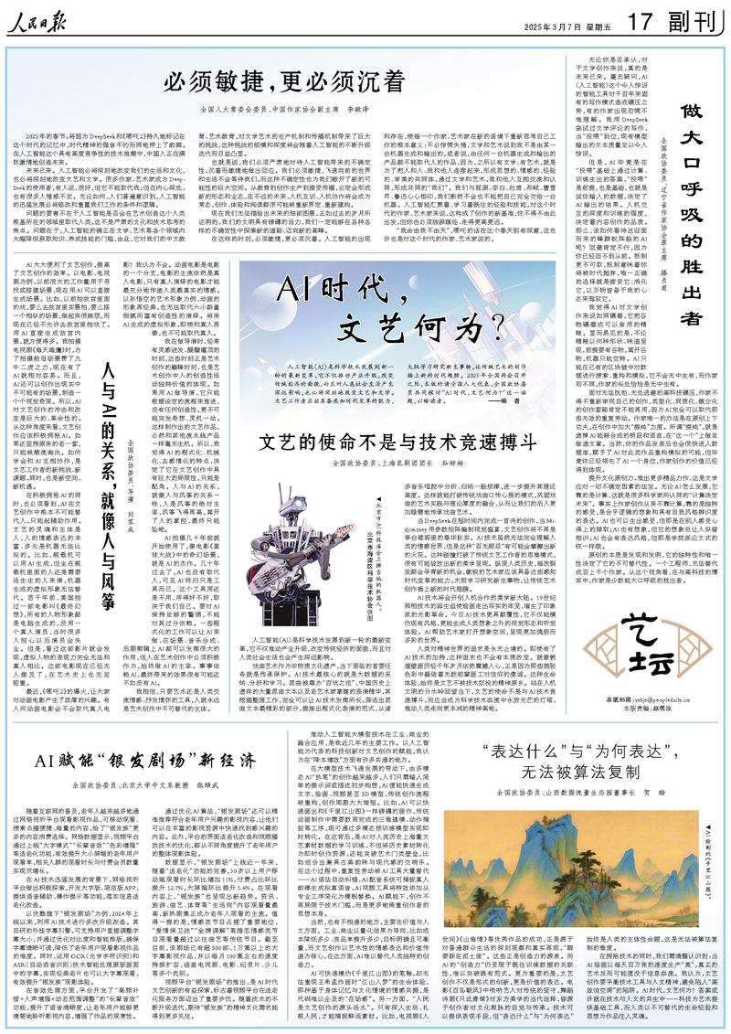 人工智能(AI)是科學(xué)技術(shù)發(fā)展到新一輪的最新變革,它不僅推動產(chǎn)業(yè)升級,改變傳統(tǒng)經(jīng)濟(jì)的面貌,而且對人類社會生活產(chǎn)生深遠(yuǎn)影響,也必將深刻地改變文藝和文學(xué)。文藝工作者應(yīng)該具備感知時(shí)代變革的能力,大膽學(xué)習(xí)研究新生事物,讓傳統(tǒng)藝術(shù)的創(chuàng)作插上新的時(shí)代翅膀。2025年全國兩會召開之際,本版約請全國人大代表、全國政協(xié)委員共同探討“AI時(shí)代,文藝何為?”這一話題,以饗讀者。