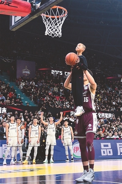 本屆全明星賽第二節(jié)最后的一次暫停時,現(xiàn)場上演了溫情一幕:北區(qū)明星隊(duì)首發(fā)中鋒楊瀚森,舉起來自吉林省孤兒學(xué)校的小朋友趙路健,幫助他完成了一次扣籃。