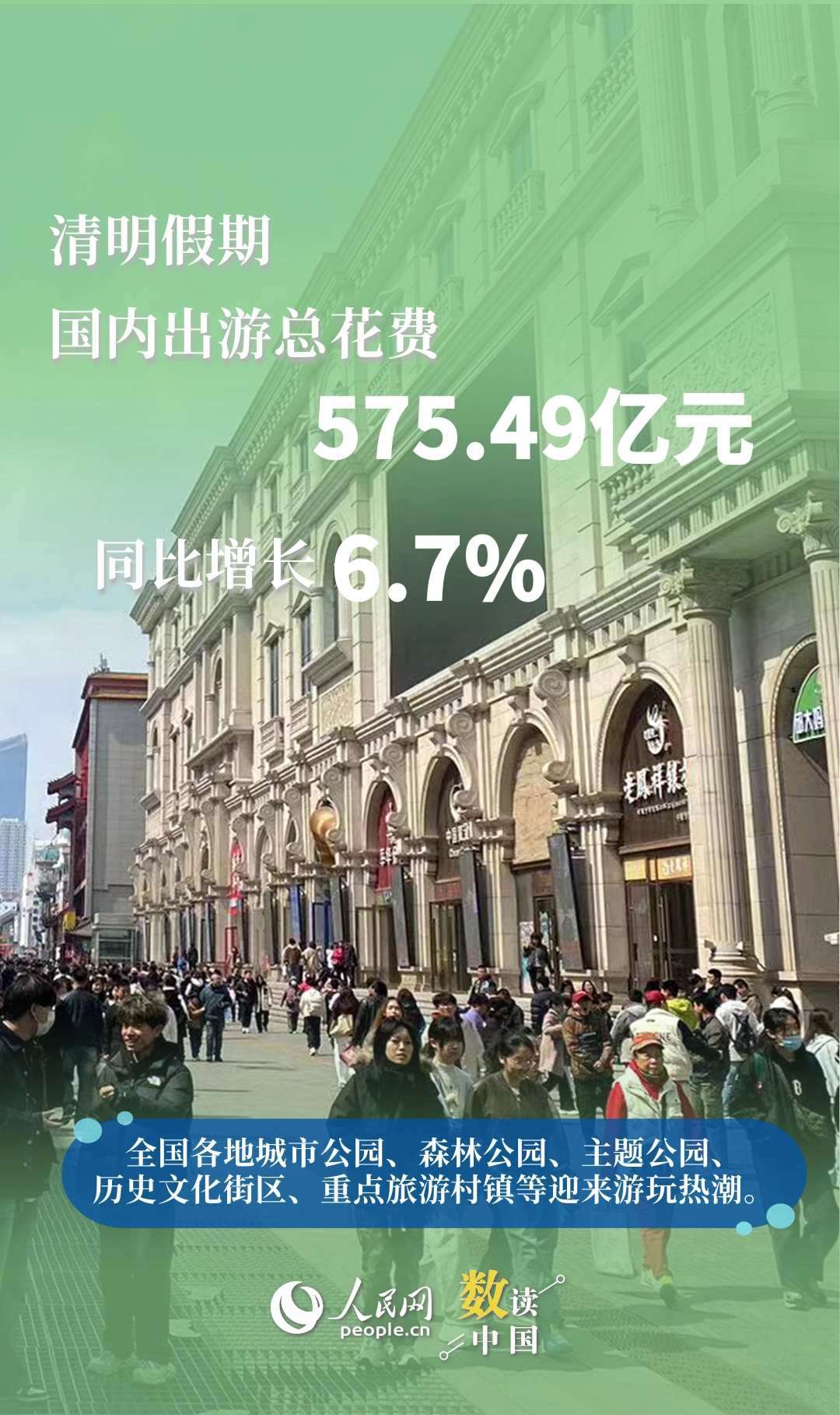 經文化和旅游部數據中心測算,清明節(jié)假期3天,國內出游總花費575.49億元,同比增長6.7%。