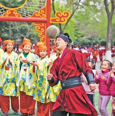蹴鞠起源于齊國(guó)故都臨淄,是足球運(yùn)動(dòng)的雛形,有著2300多年的歷史?!磅怼币鉃樘?、踏,“鞠”則指外包皮革、內(nèi)填動(dòng)物毛發(fā)的球。唐宋時(shí)期,蹴鞠已成為一種在春季廣泛開(kāi)展的節(jié)令活動(dòng),男女老少均可參與。2004年,臨淄被國(guó)際足聯(lián)確認(rèn)為世界足球起源地;2006年,蹴鞠被列入第一批國(guó)家級(jí)非物質(zhì)文化遺產(chǎn)名錄。