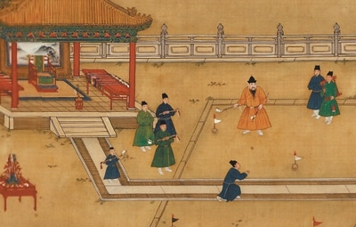捶者,打也;丸者,球也?!安簧賹W(xué)生剛接觸捶丸時(shí),說(shuō)它像現(xiàn)代的高爾夫。其實(shí),捶丸比高爾夫運(yùn)動(dòng)歷史更悠久。”平頂山學(xué)院陶瓷學(xué)院院長(zhǎng)梅國(guó)建介紹,捶丸源自唐代擊鞠(馬球)和步打球,傳至宋朝逐漸演變?yōu)橐来螕羟虻姆菍?duì)抗性比賽,名稱(chēng)也變?yōu)榇吠?,現(xiàn)藏于故宮博物院的《明宣宗行樂(lè)圖》中就描繪了宮中捶丸的場(chǎng)景。