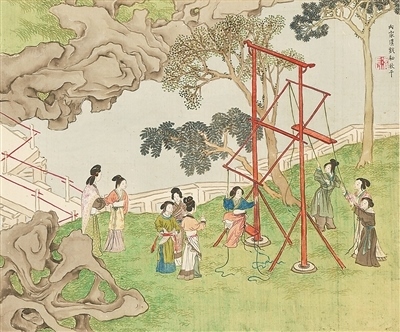 秋千,古稱(chēng)“千秋”,可追溯至春秋時(shí)期,后改為“秋千”。據(jù)《荊楚歲時(shí)記》記載:“春時(shí)懸長(zhǎng)繩于高木,士女衣彩服坐于其上而推引之,名曰打秋千。”在古代,清明節(jié)更是有著秋千節(jié)的別稱(chēng),可見(jiàn)古人對(duì)春日蕩秋千的喜愛(ài)。