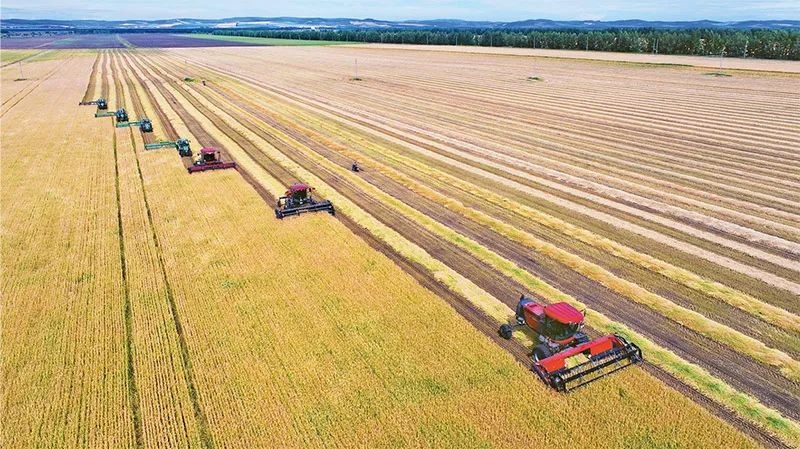 實(shí)施鄉(xiāng)村振興戰(zhàn)略,必須把確保重要農(nóng)產(chǎn)品特別是糧食供給作為首要任務(wù),把提高農(nóng)業(yè)綜合生產(chǎn)能力放在更加突出的位置,把“藏糧于地、藏糧于技”真正落實(shí)到位。圖為2022年8月17日,大型秋收機(jī)械在內(nèi)蒙古呼倫貝爾農(nóng)墾牙克石農(nóng)牧場(chǎng)有限公司第四連(隊(duì))集群割曬作業(yè)。人民圖片王國(guó)印/攝