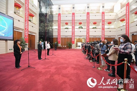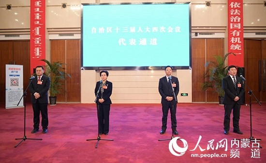 內(nèi)蒙古開啟首次代表通道,陳功明代表(左一)就生態(tài)建設(shè)問(wèn)題答記者問(wèn)。 陳立庚 攝